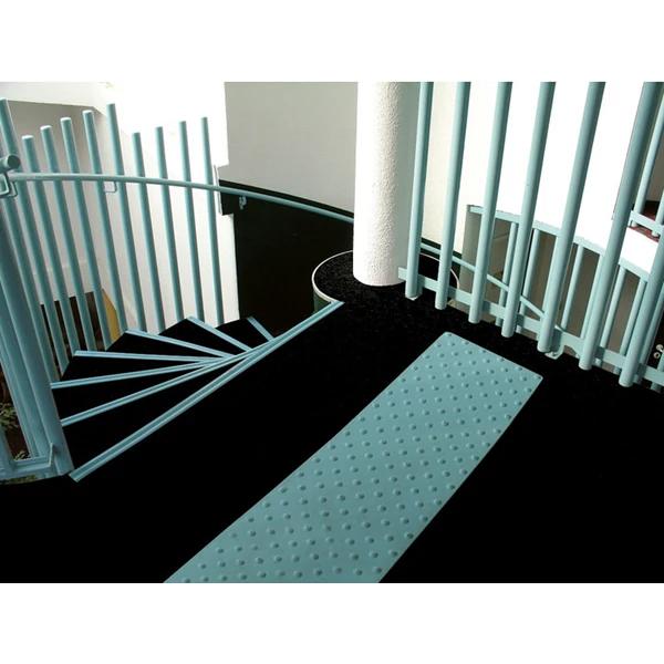 - En haut de l’escalier et sur toute sa longueur doit être posé un revêtement de sol ou un dispositif à 50 cm de la première marche et ainsi éveiller la vigilance grâce à un contraste visuel et tactile.