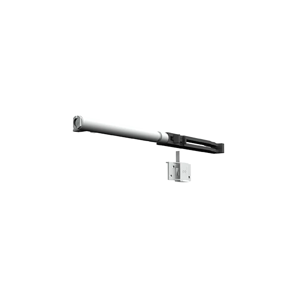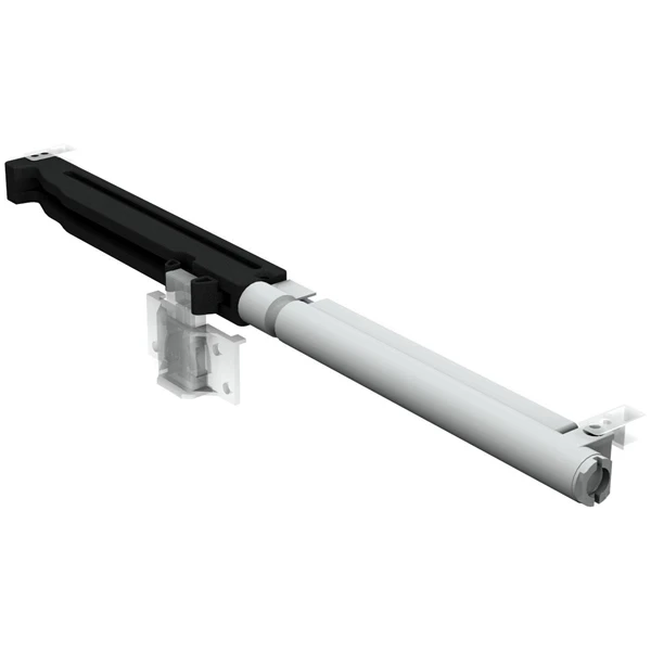 - Grâce à un doigt d’entraînement fixé sur le panneau, l’amortisseur accompagne la porte de façon automatique jusqu’à la position fermée.